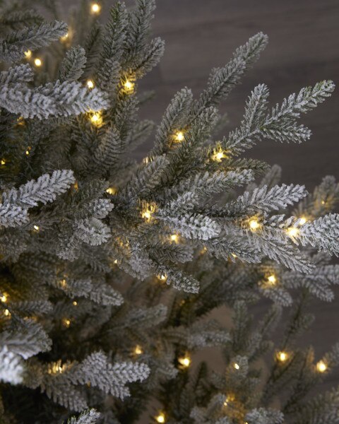 - 7ft Snowy Norway Spruce Christmas tree features 900 Warm White Micro LED Lights