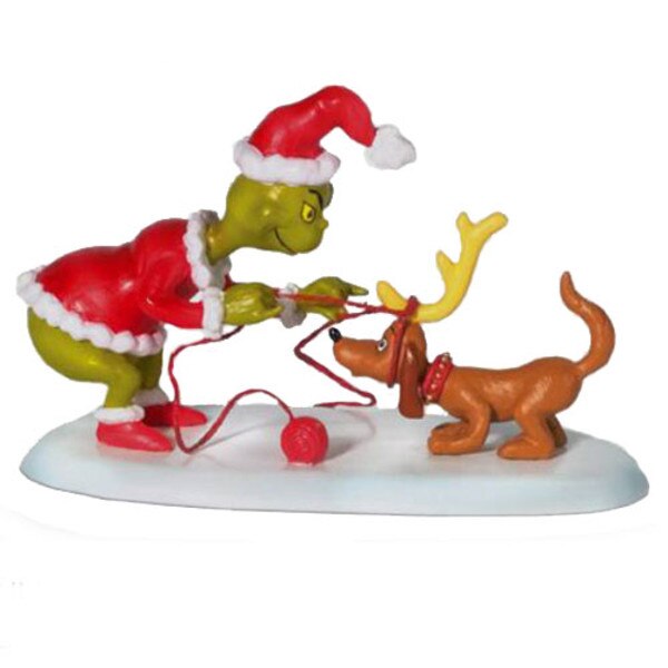 This village accessory depicts Dr. Seuss's The Grinch using twine to harness Max to his sleigh in the "All I Need Is A Reindeer" piece. Use this piece to add charm to your Grinch Village collection.