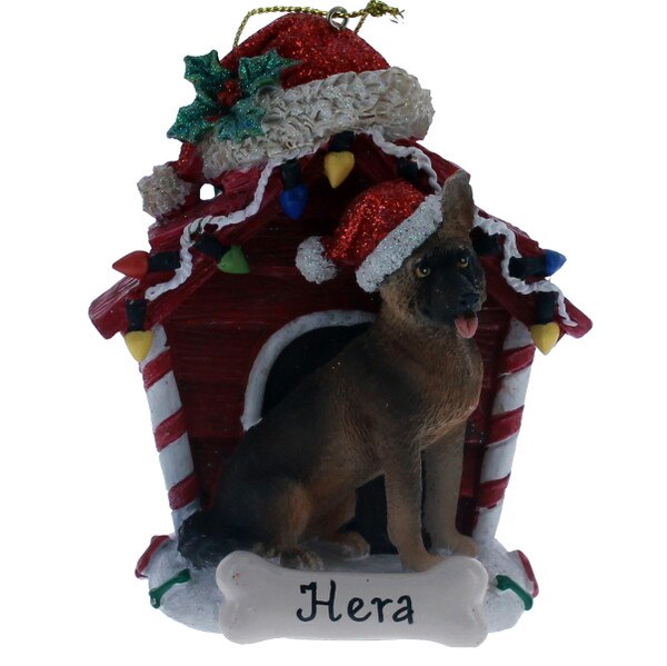 For all the German Shepherd lovers out there, this Kurt Adler ornament is perfect for you! It features a German Shepherd with a Santa hat in front of their doghouse, which is decorated in Christmas lights and has a giant Santa hat on top. In front of the Shepherd is a big bone where you can personalize this ornament with your four legged friend's name.