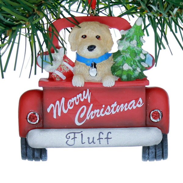 For the Labradoodle dog owner, this Kurt Adler personalizable ornament is perfect for you. It features a Labradoodle in the back of a red pickup truck with "Merry Christmas" written on the tailgate, a decorated Christmas tree and gift. Made of quality resin and measures 3.25in H x .5in W x 3.25in L.
