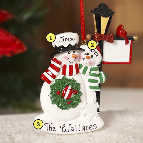 Customize this ornament with the names of your family or friends. It features a snowman couple standing by a lamp post and enjoying the holiday season. Measures 4.75 inches in height.