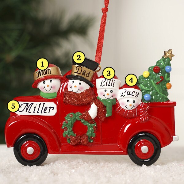 Customize this ornament with the names of your family or friends. It features a snowman family of 4 hauling their tree home in the back of a red truck. Measures 3.25 inches in height.
