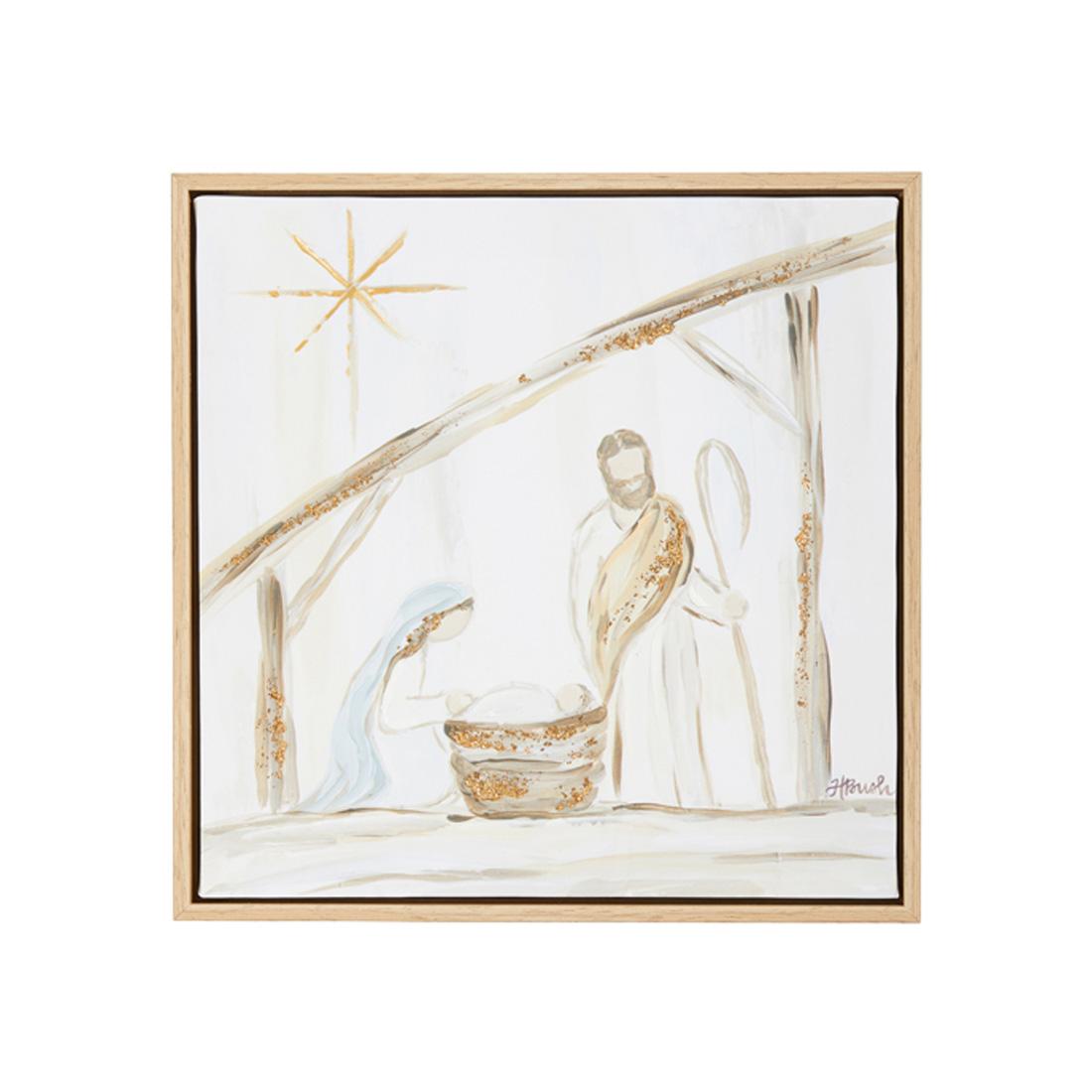 Celebrate the true meaning of Christmas by displaying this canvas wall art in your home for the holiday season. It features Mary and Joseph watching over baby Jesus as the Star of Bethlehem shines above. Measures 13.5 inches in height.