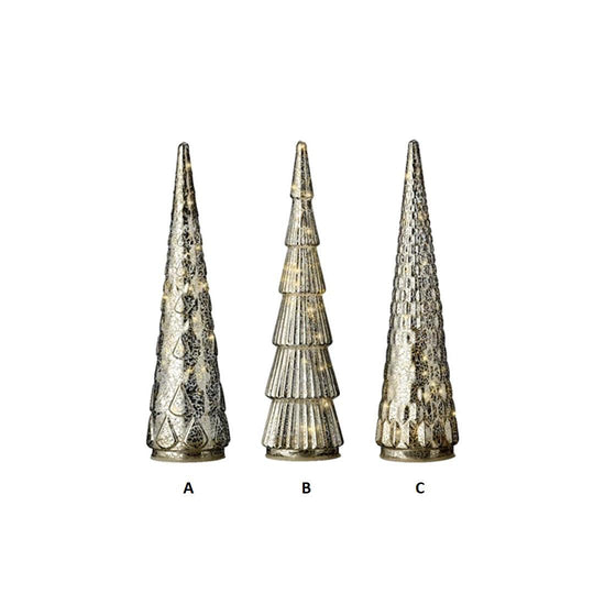 Add a little elegance to your holiday decor with this assortment of trees. It features three different style of silver trees to choose from, each containing 15 warm white LED lights that light up using 3-AA batteries not included. Each sold separately and measure 12.99 inches in height.Â