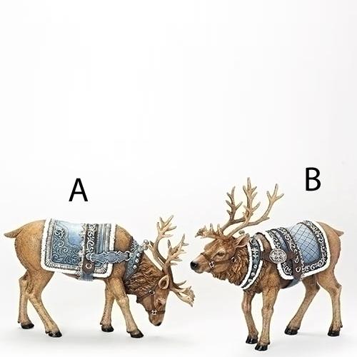 Add some beauty to your home decor with this assortment of majestic reindeer. They both have large antlers and have a blue saddle on their back. One is holding his head up , while the other has his head down. Â Each sold separately and measure 12 inches in height.