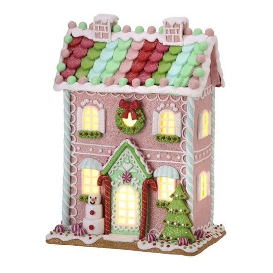 If your holiday decor includes gingerbread houses, you may want to add this one to your collection. It is pink in color and has lots of green, blue, pink, and red candies on the roof. A snowman stands on one side of the door and a decorated tree is on the other. Measures 14 inches in height and lights up with LED lights.
