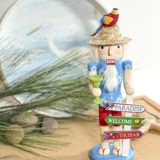 Dressed for a day on the beach, this nutcracker is ready for a day of relaxation. With signs pointing the way, he is sure to find paradise or a tiki bar of his choice. With a parrot on his straw hat and a cocktail in his hand, he is equipped for success at a Margaritaville contest. Measures 14 inches in height.