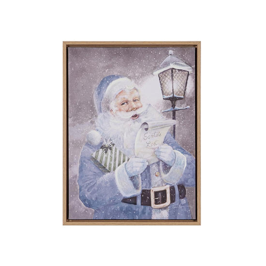 Add this beautiful canvas wall art to your holiday decor. It features Santa dressed in blue with a big smile on his face, holding his list and a gift in his hands, while standing by a lamp post. Measures 15.5 inches in height.
