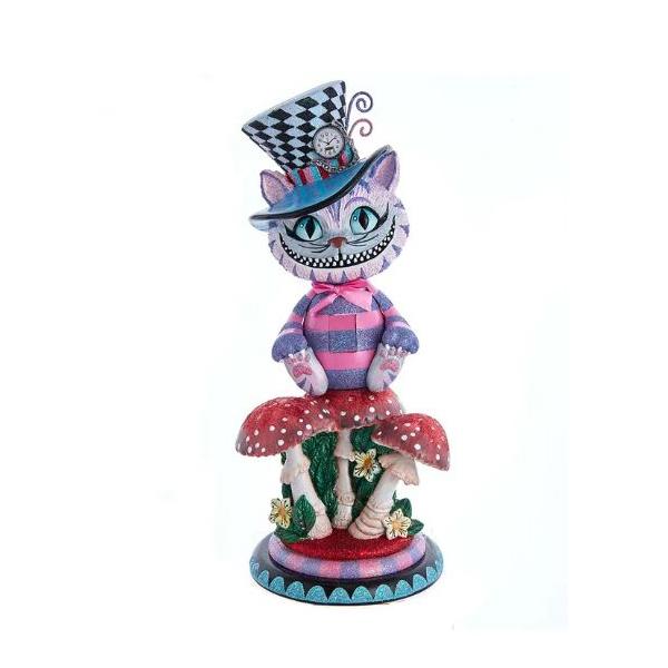 As part of the âAlice in Wonderlandâ collection, Cheshire Cat is wearing a blue and black checkered top hat with a watch on it and a pink and purple outfit. He has his familiar mischievious grin on his face as he happily guides Alice on her journey. Measures 15 inches in height.