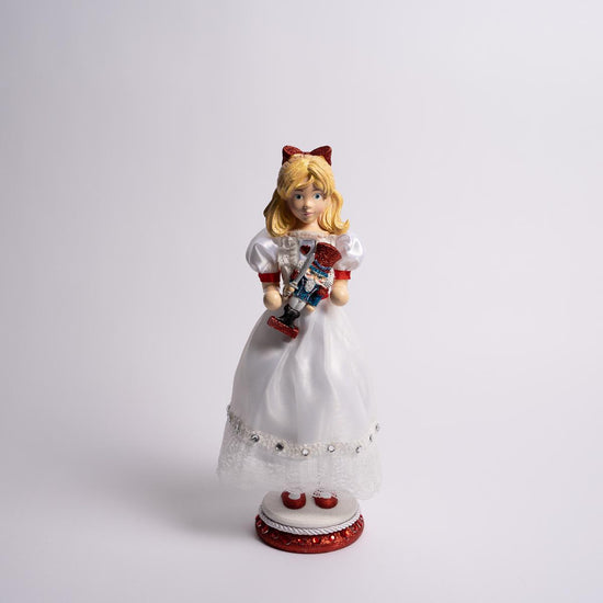 Clara from âThe Nutcracker Suiteâ is ready to dance the night away with her charming Nutcracker Prince. Dressed in her elegant white dress with a touch of red and jewel accents, while holding her nutcracker in hand. Measures 15 inches in height.