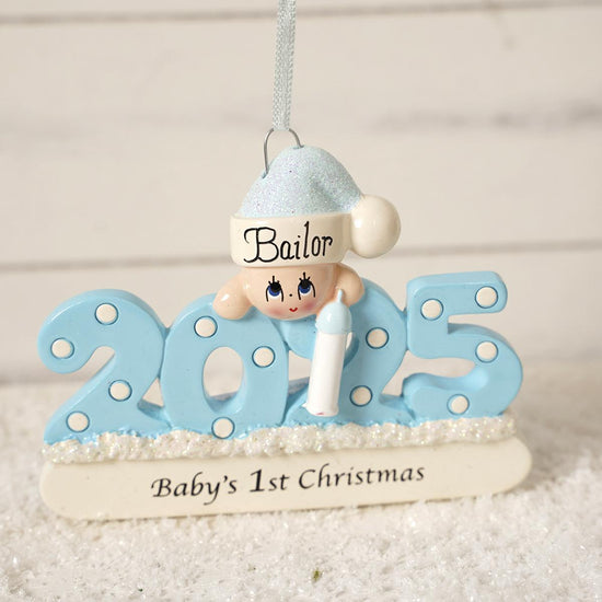 Celebrate your baby boy's first Christmas by having this ornament customized for him. It features a white base with the pre-printed words âBaby's 1st Christmasâ underneath the manufactured blue polka dotted numbers â2025â, and a baby on top dangling his bottle.