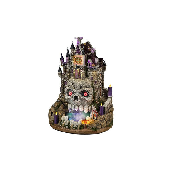 Cursed With Ruins by Lemax Villages. Welcome to the âCursed Ruinsâ where a monstrous skull with crimson eyes awaits to cast a gaze upon anyone brave enough to approach. With skeletal remains laying around, who would dare go inside? Measures 13.19 inches in height. Adapter included for lights and sounds.