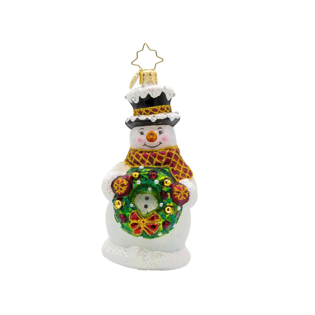 Merry Mittens Ornament by Christopher Radko features a snowman wearing a black top hat and a red and gold scarf. He is holding a wreath in his hands and is ready to spread holiday cheer. Measures 4.5 inches in height.