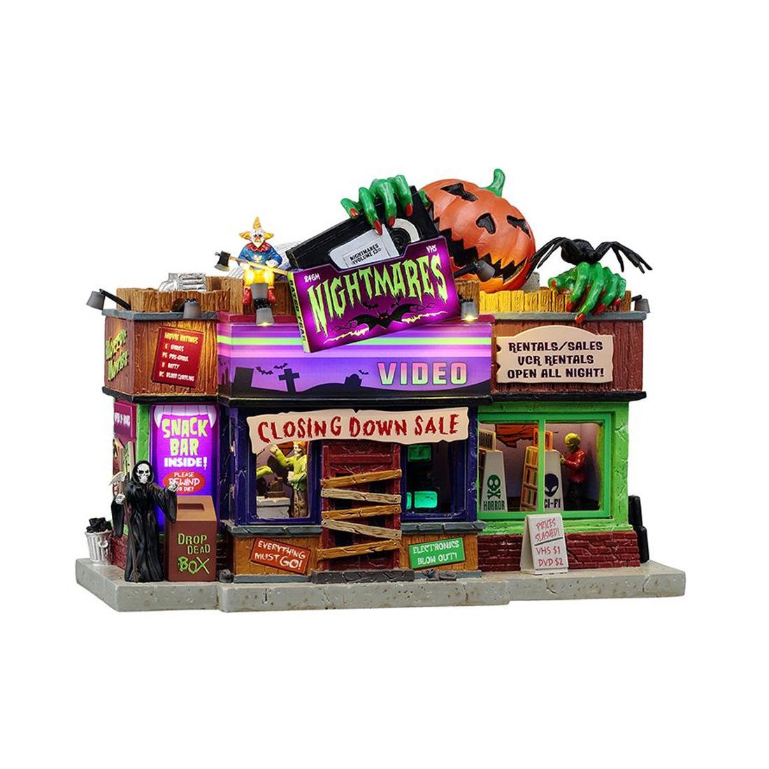 Nightmares Video by Lemax Villages. Nightmares Video has been your go-to place to rent horror movies for years. Now it is closing its doors for good after this one last sale. Be cautious when entering this time, for the Grim Reaper and a scary clown lurk about outside. Measures 7.28 inches in height. Lights up with adaptor included.