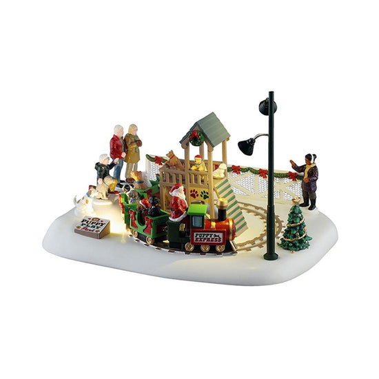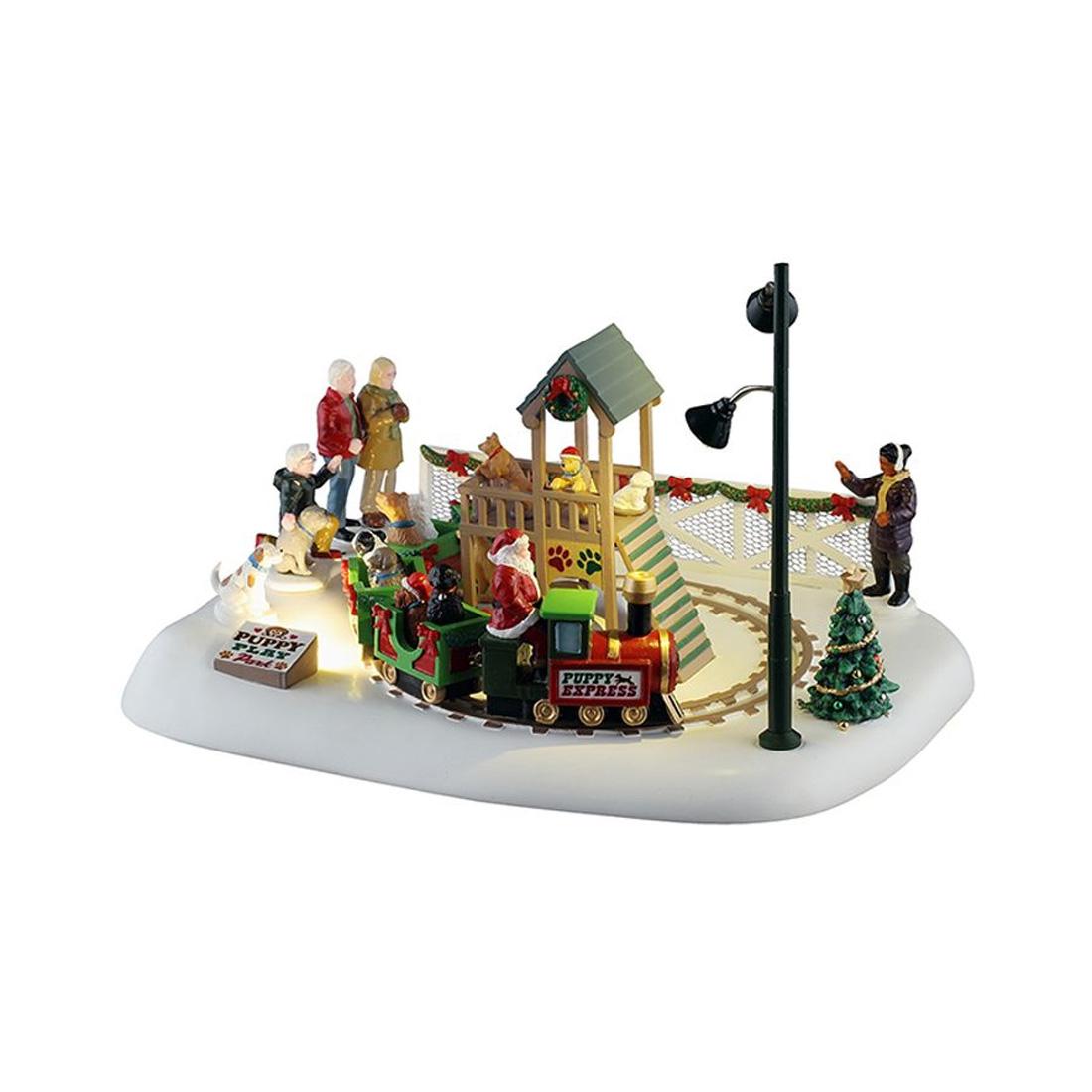Puppy Play Park by Lemax Villages. Let you dog enjoy spending time with Santa and other dogs at this puppy park, while they take a ride on the puppy express driven by Santa himself. Measures 6.10 inches in height. Lights and movement require 3-AA batteries not included.