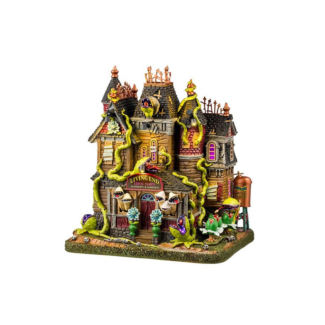 The Living End by Lemax Villages. This Exotic Plants Nursery is not like most of the ones you visit. It has carnivorous plants guarding the outside, waiting for unsuspecting prey. With skeletal remains lying around, we don't have to speculate on what happens to them. Measures 9.13 inches in height. Lights up using 3-AA batteries not included.