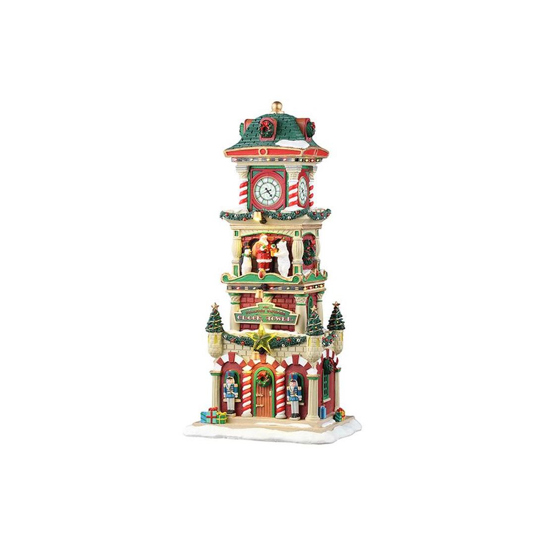 The Village Square Clock Tower by Lemax Villages is part of the âSanta's Wonderlandâ collection. Come visit the Village Square Clock Tower and witness the magic of the holiday season as the clock chimes. It is decorated with wreaths, trees, and lights, while nutcrackers greet you at the door. Measures 11.34 inches in height. Lights up using 3-AA batteries not included.