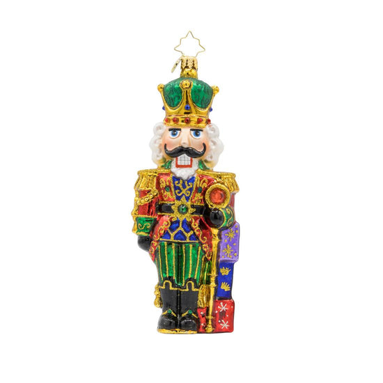 Yuletide Sentinel Ornament by Christopher Radko features a nutcracker dressed in red and green with gold accents. He is ready to take the lead on the journey ahead. Measures 6.5 inches in height.