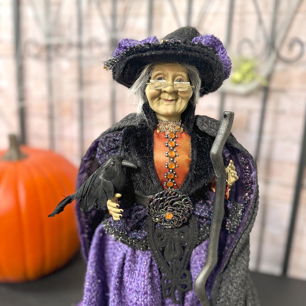 The Vera Witch by Karen Didion is sure to add luxury to your home this Halloween season. She shows off her style while dressed in purple and black with silky orange accents, a pendant necklace, and her black hat with a hint of purple. She has a black crow in one hand and a broom in the other. Maybe she's ready take flight with the crow leading the way. Measures 21 inches in height.
