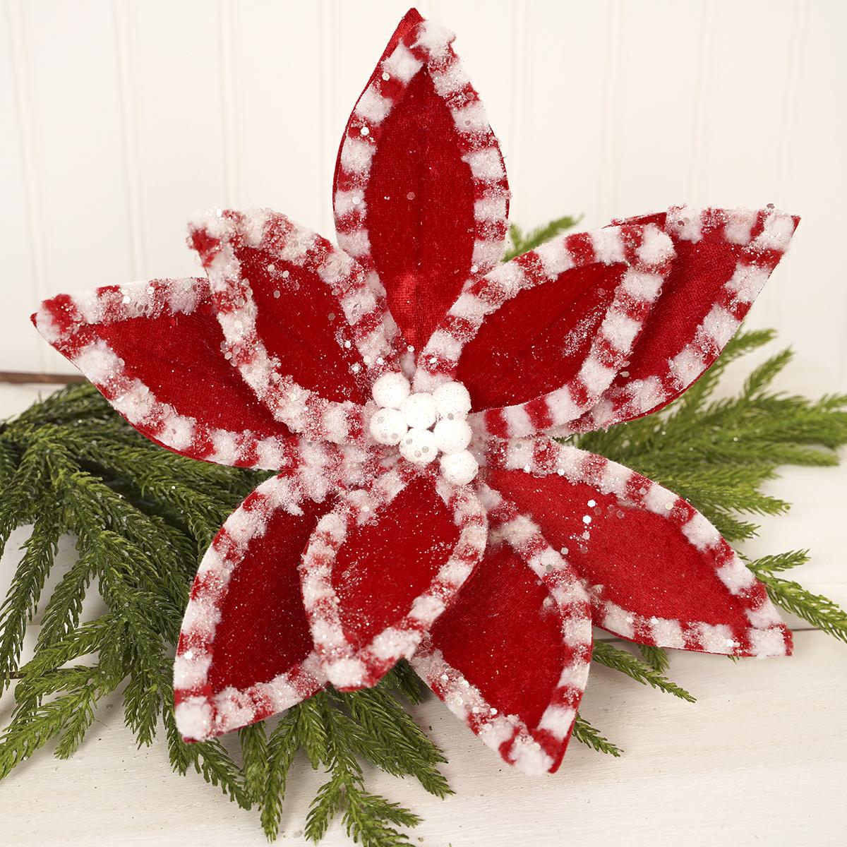 Add this poinsettia to your holiday decor this Christmas season. It features red petals with red and white edges and sugar crystals scattered about, and white berries in the center. Measures 22 inches in length.
