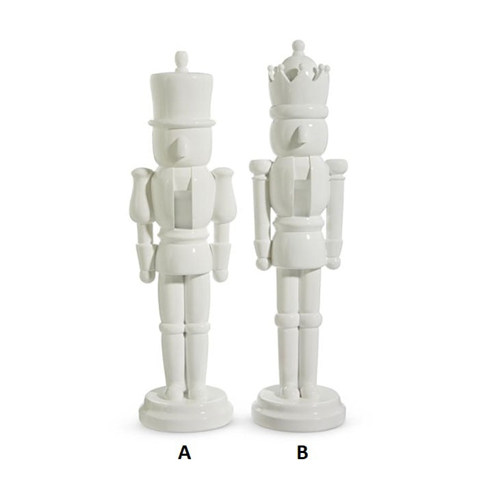 These charming nutcrackers are white with no paint or colors. One has on a cap while the other one has on a top hat. Choose your favorite or collect both. Each sold separately and measure 22 inches in height.