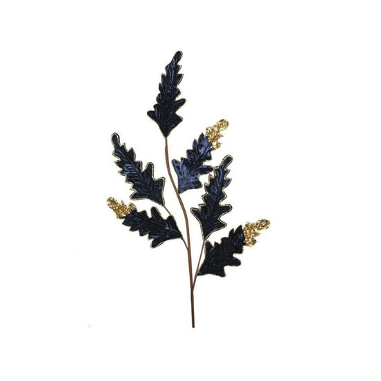 If midnight blue is your color theme, then you may want to add this velvet acanthus spray to your decor. It has 6 leaves of which three have gold glitter tips. Measures 32 inches in length.