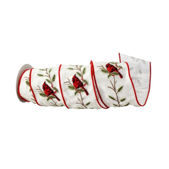 If you love cardinals, then you may want to add this ribbon to your home decor. It features white ribbon with red cardinals sitting on pine branches. Measures 5 yards in length.