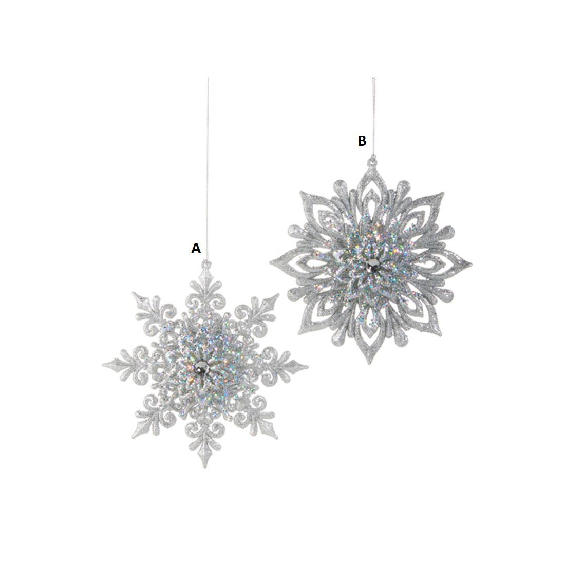 Add a touch of beauty and elegance to your holiday decor with this assortment of silver snowflake ornaments. It features two different shaped snowflakes that are covered with glitter and have a jewel in the center. Each sold separately and measure 5.5 inches in height.