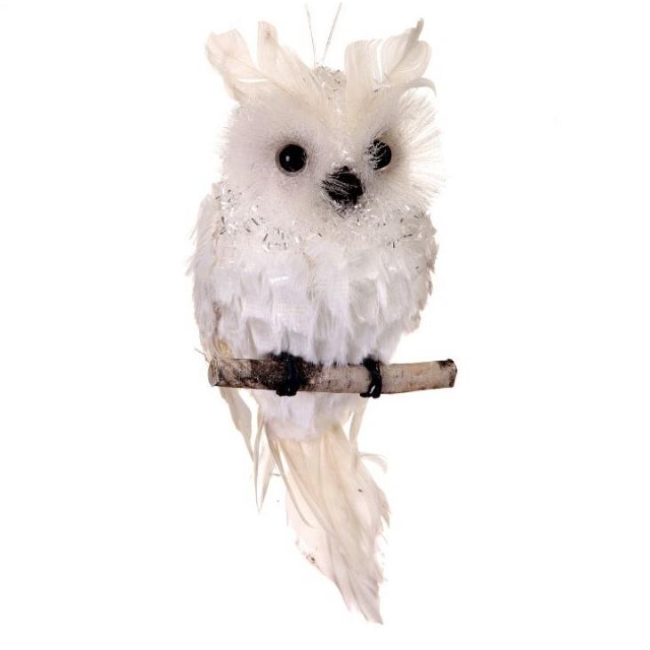 A feathered friend white owl ornament that will be a nice addition to your holiday decor or Christmas tree. Measures 5 inches in height and is made of feather, styrofoam and plastic.