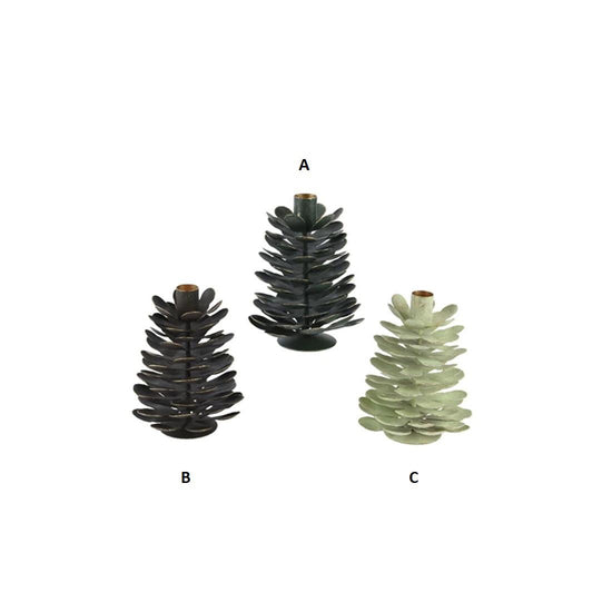 Add a touch of the outdoors to your home decor with this assortment of candle holders. It features a brown, black, or white antique pinecone that holds taper candles. Each sold separately and measure 6.3 inches in height.