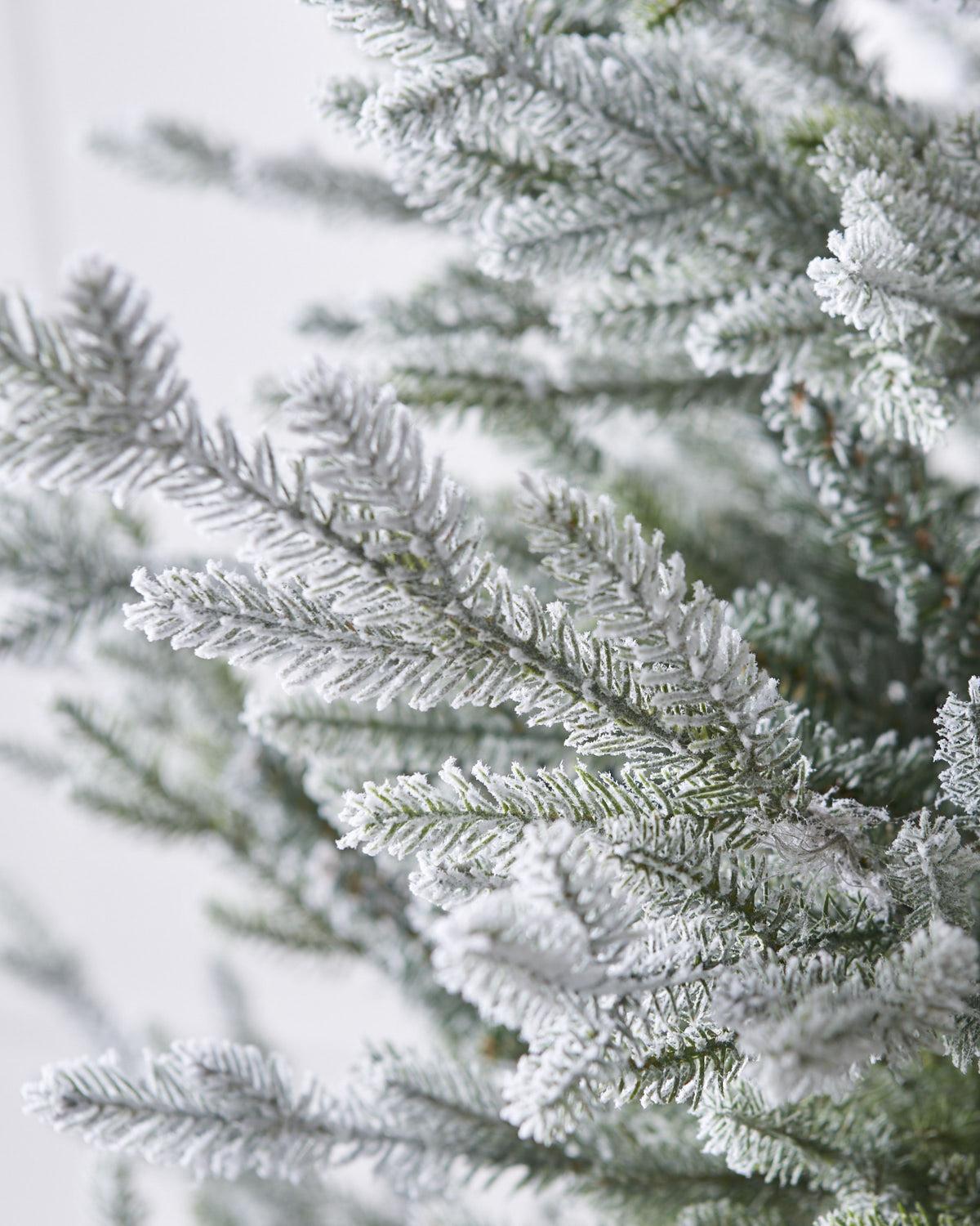 - 6ft Snowy Flocked Norway Spruce Christmas tree with 2,837 tips on hinged branches.