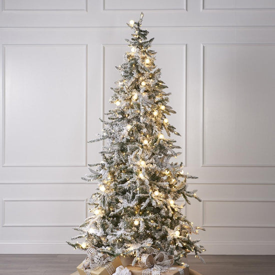 - 7.5ft Snowy Flocked Slim Balsam pine tree features 1278 tips.
