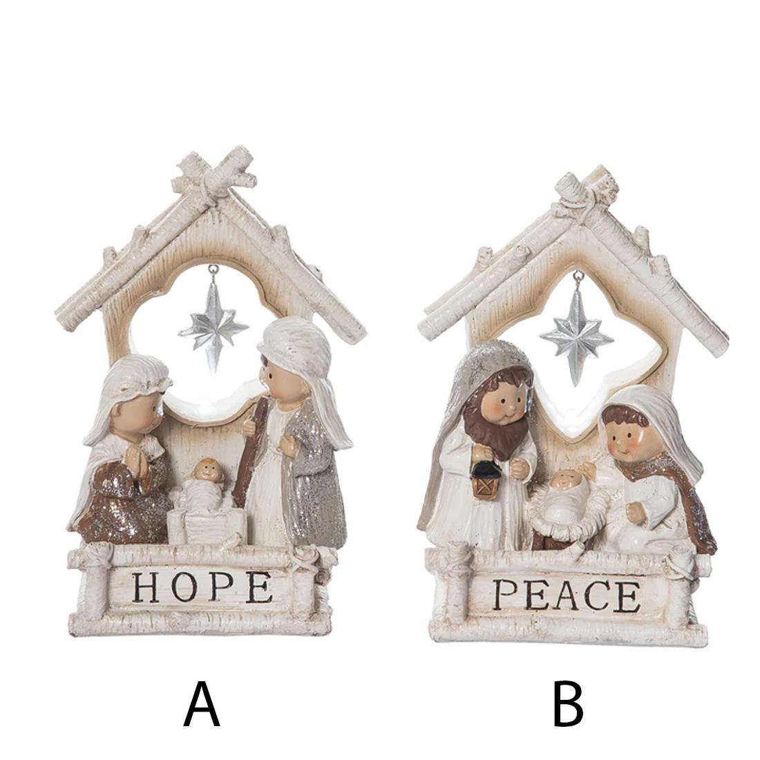 Show the true meaning of Christmas by displaying this assortment in your home. It features two different nativity scenes of Mary, Joseph, and baby Jesus to choose from. One has the word âHopeâ and the other has the word âPeaceâ. Each sold separately and measure 7.25 inches in height.
