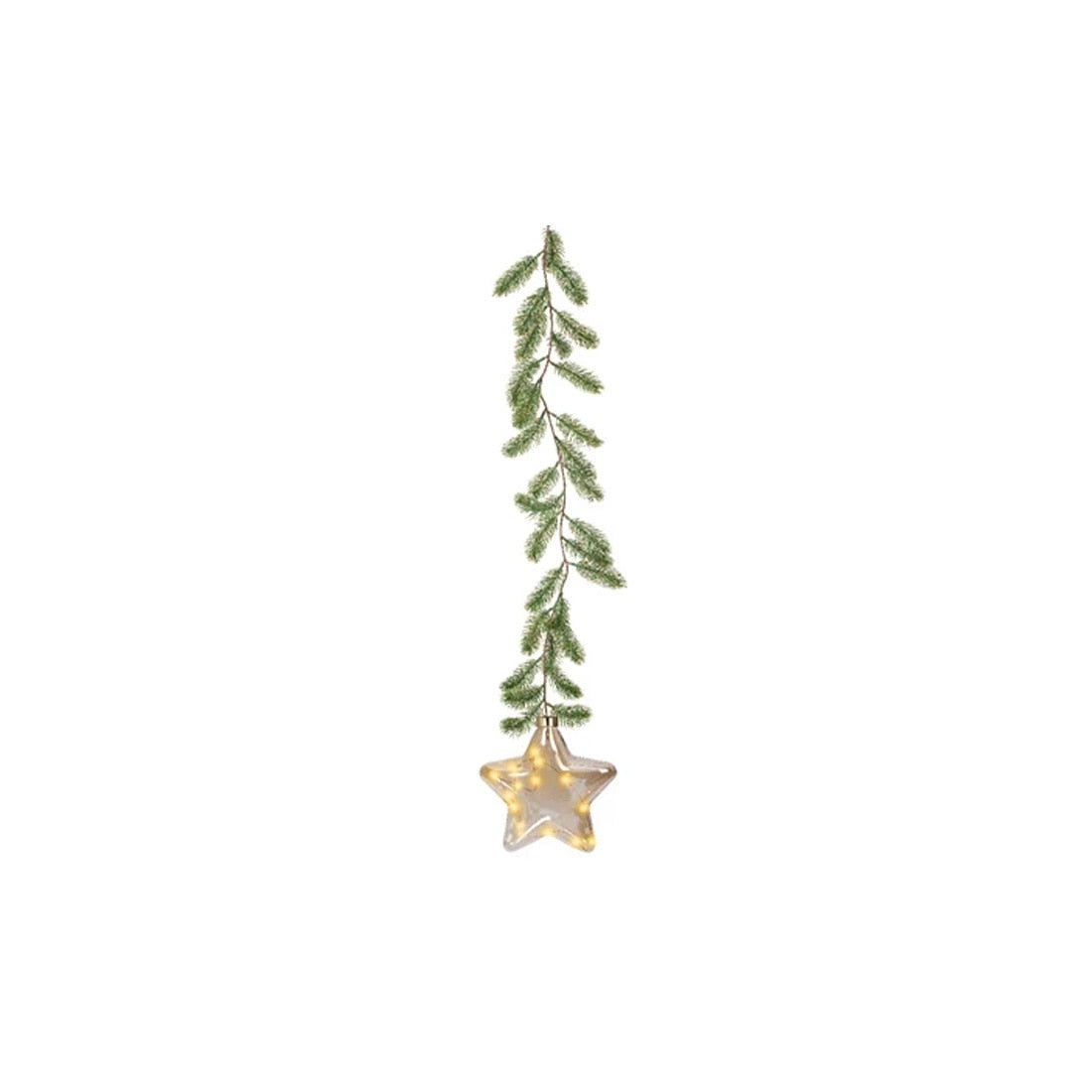 Add this glass Amber LED Star to your decor for the holiday season. It features an amber star hanging from a green pine strand with 15 LED classic warm lights that require batteries. Measures 7.87 inches in height. Indoor use only. Timer 6 hours on/18 hours off.