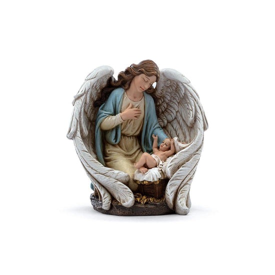 What a beautiful scene! An angel looking upon baby Jesus with such love and admiration. She has her wings wrapped around him to protect him from the elements of the night air.