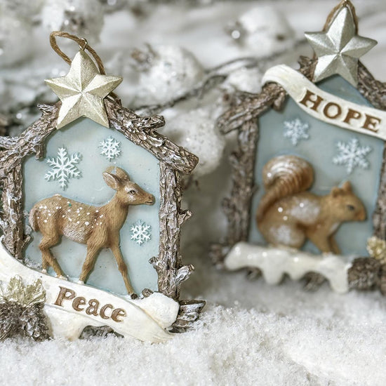 This assortment of log frame ornaments feature a fox with the word Believe on it, another has a deer with the word Peace on it, and the other has a squirrel with the word Hope on it. Each sold separately and measure 4 inches in height.