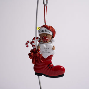 This ornament features an African American baby in a boot with the words “Baby's First Christmas”. It can be personalized and measures 4 inches in height.