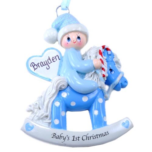 Celebrate your baby boy's first Christmas by having this ornament personalized with his name. It features a baby dressed in blue on a blue polka dotted rocking horse with the pre-printed words "Baby's 1st Christmas. Measures 6 inches in height.