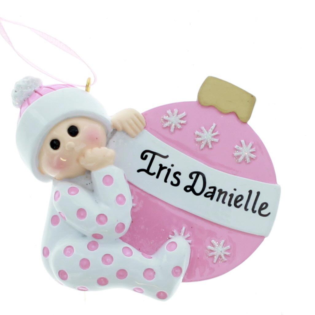 With her polka dot pajamas and cute pink beanie, this baby girl is sitting next to a pink ornament that can be personalized with your child's name. Measures 3.25 inches in height.Â