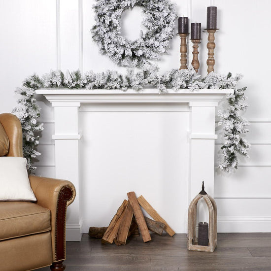 - 9ft Balsam Snowy Flocked Garland fluffs to 10in in diameter.