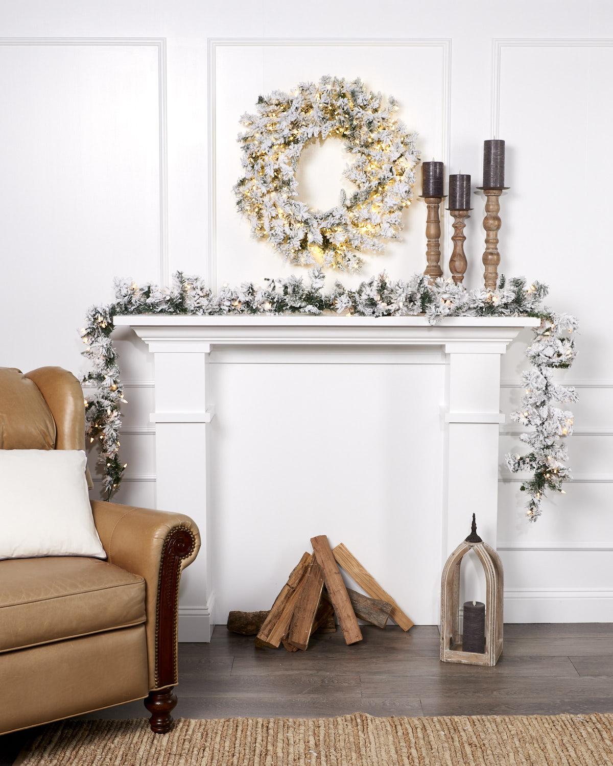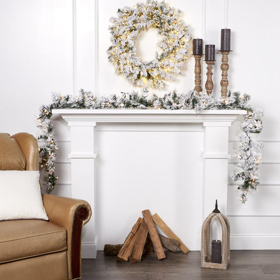 - 9ft Balsam Snowy Flocked Pre-lit Garland with 150 tips and fluffs out to 10in in diameter..