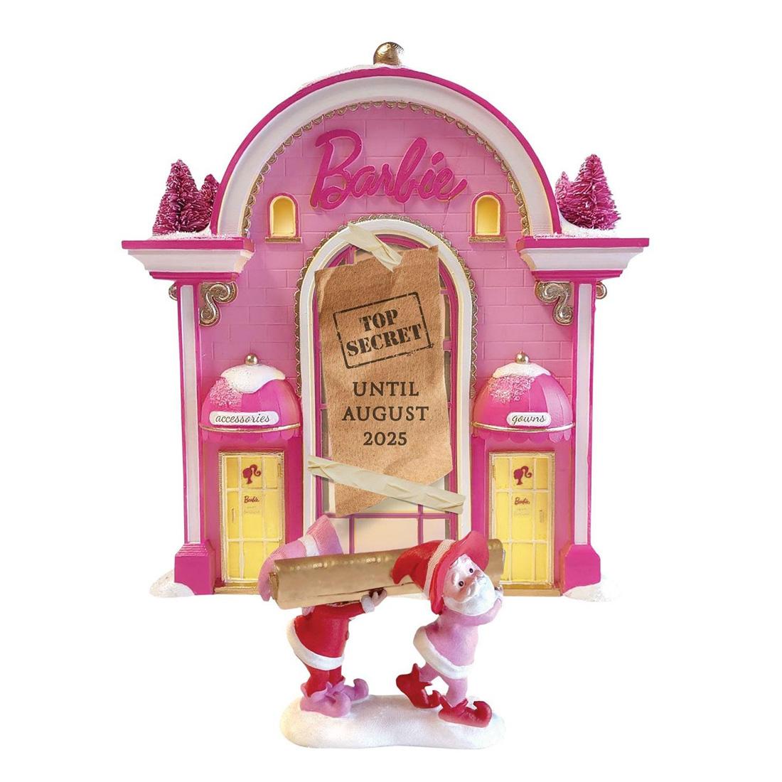 Barbie Gown Boutique Set Of 2 is part of the âNorth Pole Villageâ collection. This pink building celebrates Barbie and her new fashion design while the elves secretly work on the project. This August, Mattel will reveal the 2025 Holiday Barbie - a dazzling new design that celebrates the timeless elegance of the season. Check back in August to see the interior of this introduction. Measures 6.4 inches in height. Lights up using USB adapter included. Â