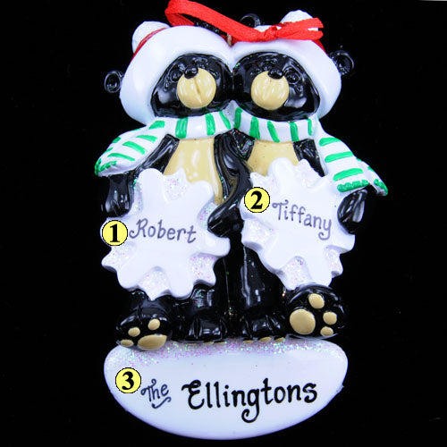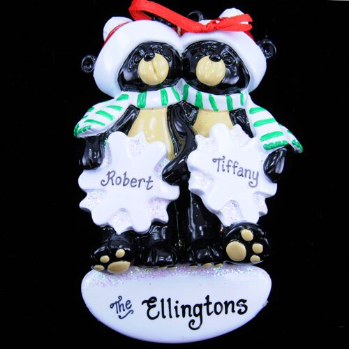 Customize this ornament with the names of your favorite couple. It features a happy bear couple dressed in their winter attire, holding snowflakes. Measures 4.5 inches in height.