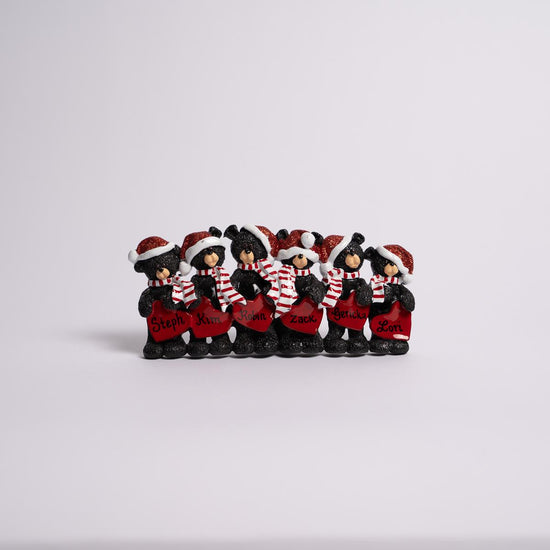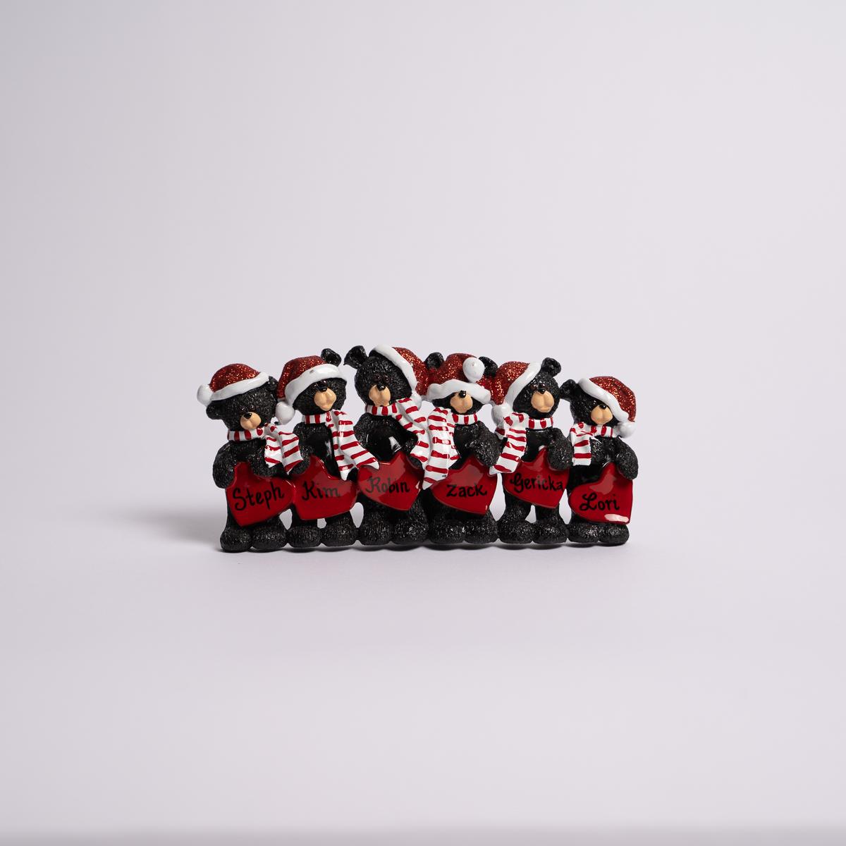 Customize this ornament with the names of your loved ones. It features a family of six black bears dressed in Santa hats and scarves, holding a heart in their paws. This ornament stands on a table with easel backing and does not hang on a tree.