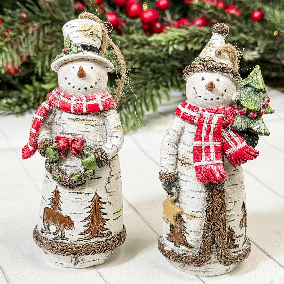 This assortment of 2 snowmen features one wearing a white top hat and holds a wreath while the other wears a white triangle-shaped hat and holds a miniature tree and a yellow star. Each sold separately and measures 5 inches in height.