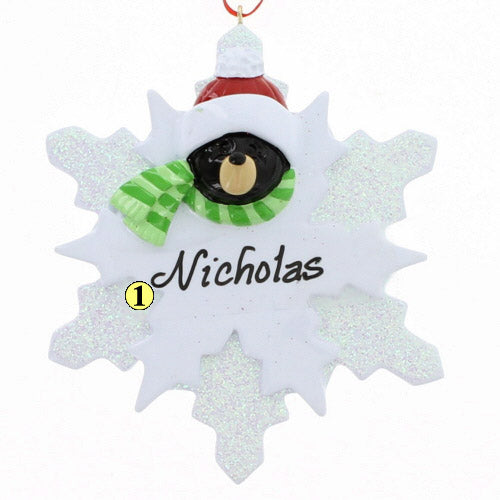 Have this ornament customized with the name of your loved one. It features a black bear with a Santa hat and green scarf at the top of a snowflake. Measures 4.25 inches in height.