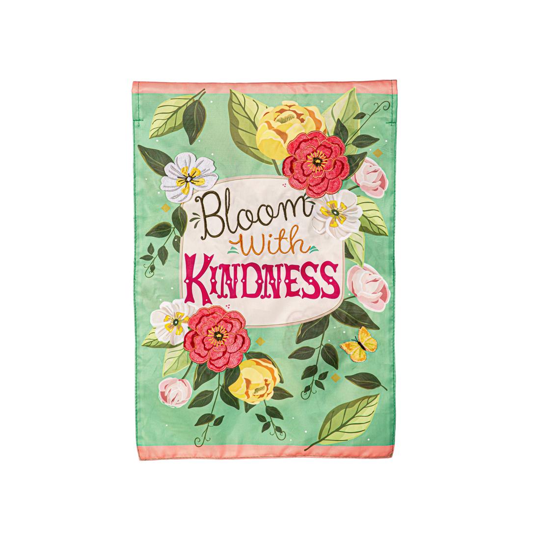 Remind everyone of how we should treat one another by displaying this garden flag in your lawn. It features blooming flowers and the words âBloom with Kindnessâ. Measures 18 inches in height.