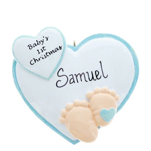 Who doesn't love baby feet? Have this ornament personalized with the name of your baby boy. It features baby feet on a white heart with blue trim that has the pre-printed words "Baby's 1st Christmas" in a small heart above. Measures 4 inches in height.