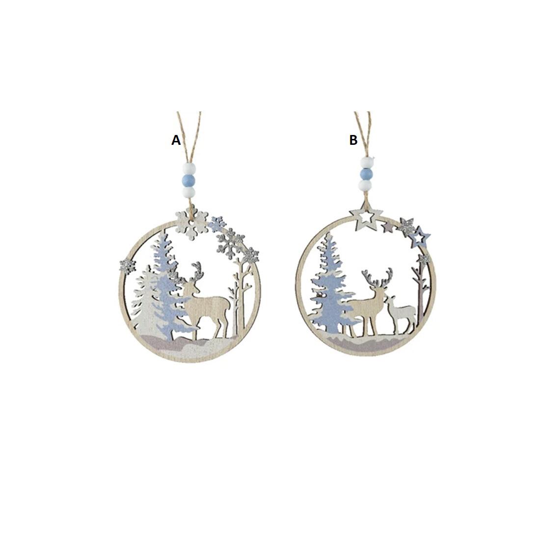 Add a touch of nature to your holiday decor with this assortment of plywood ornaments. It features a deer with large antlers standing in the forest or a family of 2 deer standing in the forest. Each sold separately and measure 4.72 inches in height.