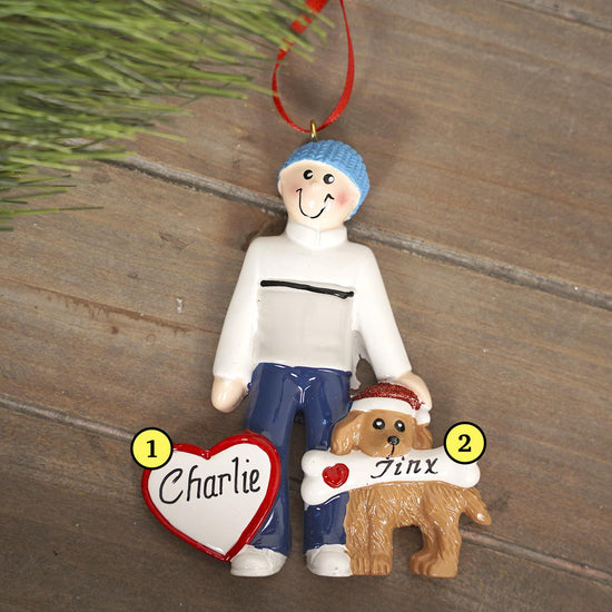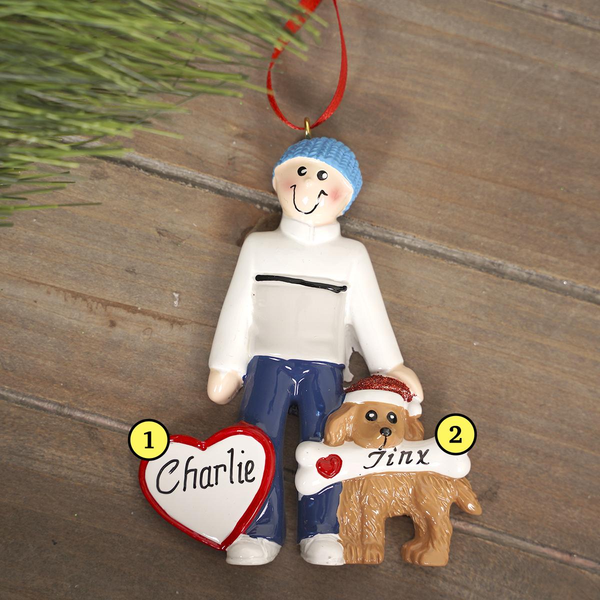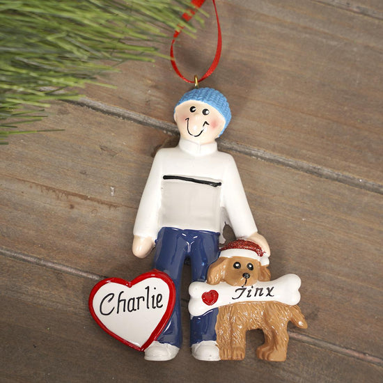 Customize this ornament for your loved one and his faithful friend. It features a boy dressed in blue and white standing with his dog at his side and a heart at his foot. The dog must have been good because it has a bone.